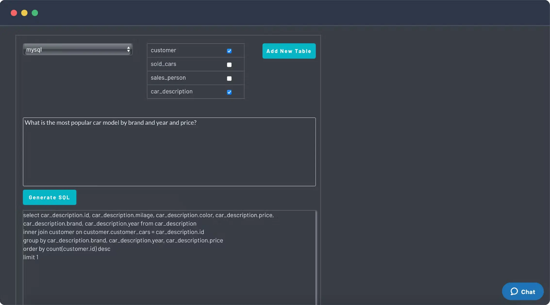 SQL Chat brings SQL clients from the traditional GUI-based stage to the CUI (Chat-based UI) stage: it integrates with ChatGPT to help you write SQL (and of course, answer any questions about databases!). It currently supports MySQL, PostgreSQL, SQL Server, and TiDB Serverless. And if you connect SQL Chat to your own database, it can write more accurate SQL queries.